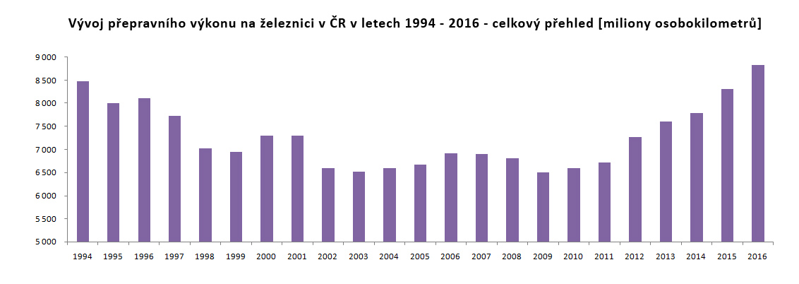 Přeprava cestujících na české železnici pokračuje v růstu již sedmým rokem v řadě. Přepravní výkon v osobní železniční dopravě meziročně vzrostl o 6,4 % na 8,8 miliardy osobokilometrů, což je nejvíce v historii samostatné České republiky. Počet cestujících se v loňském roce zvýšil o 1,5 %, celkově nastoupilo do vlaků více než 179 milionů osob.